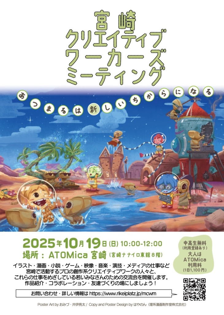 [宮崎クリエイティブワーカーズミーティング]は、イラスト・漫画・小説・ゲーム・映像・メディア・音楽の仕事など宮崎で活動するプロの創作系職業の人々と、これらの仕事をめざしている中高生・若者ための交流会です。