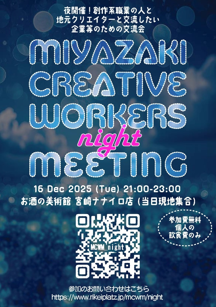 「日曜日の朝は参加できない」という声があり2025年9月よりナイトミーティングを開催しています。創作系職業の方と、地元クリエイターと交流したい企業等のための交流会として開催します。こちらは<大人限定>の夜開催イベントです。